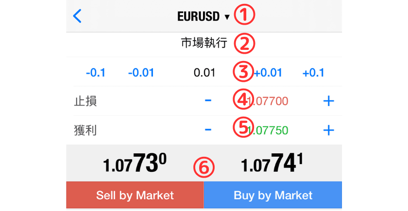 完成①~⑤设定后,点选⑥中任意一个选项,市价单就会被执行。