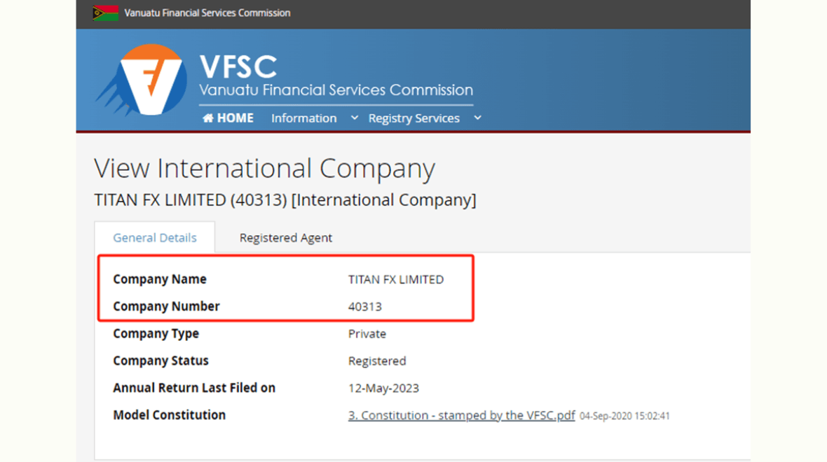 TitanFX持有的其中一个牌照(牌照号码:40313),是经过瓦努阿图共和国金融服务委员会注册并受其监管。可在瓦努阿图金融服务委员会(VFSC)官网查询到。