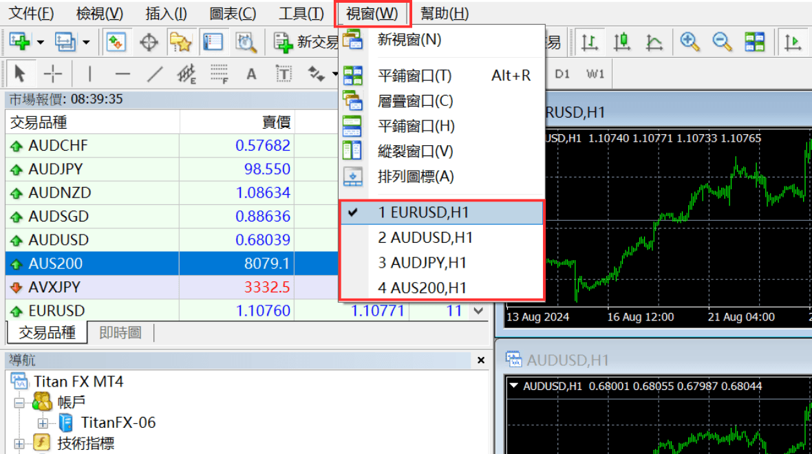 当图表栏隐藏时,您可以从选单中的「视窗」选项切换图表的选择。