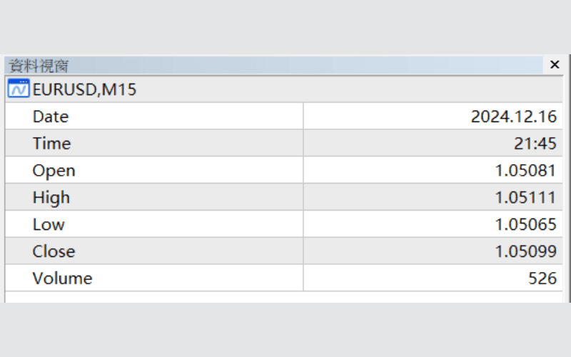 在MT4中,可以透过资料视窗显示游标所在位置的价格等相关资讯。