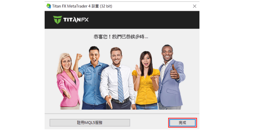 ③ 安装完成后,点击“完成”按钮,TitanFX的MT4将启动。