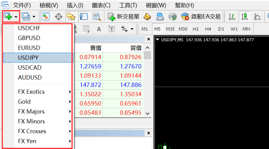 点击MT4选单「文件」中的「新图表」,选择想要显示的交易品种。