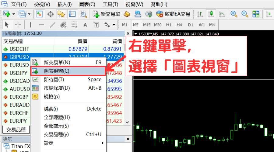 在市场报价中想要显示的交易品种上点击右键,然后选择「图表视窗」。