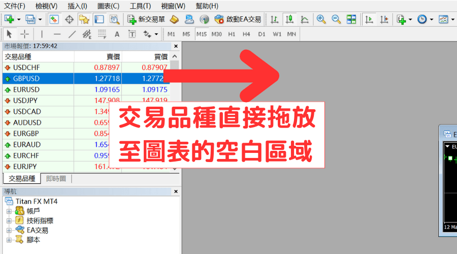 从市场报价中把想要显示的交易品种直接拖放至图表的空白区域。