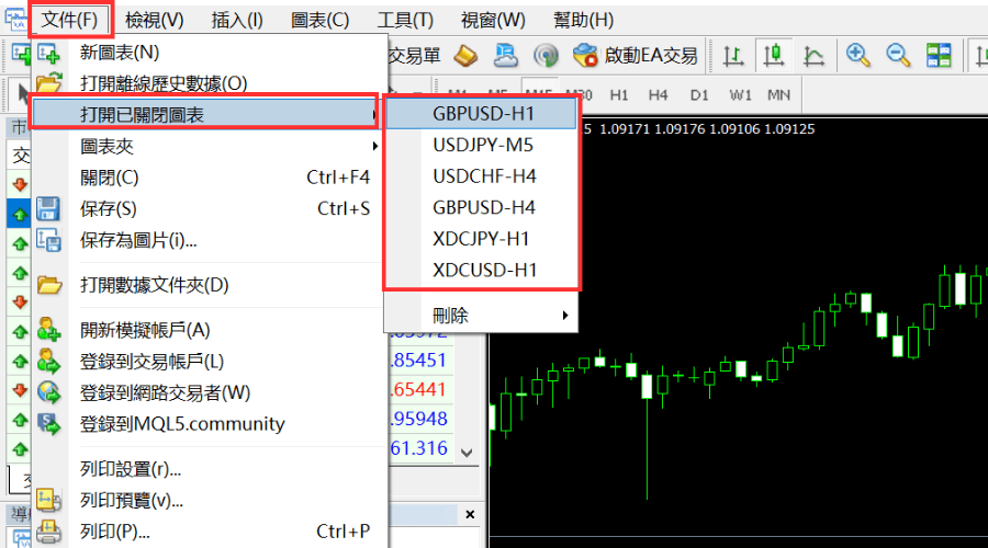 从MT4选单「文件」中的「打开删除」选择想要重开的图表。