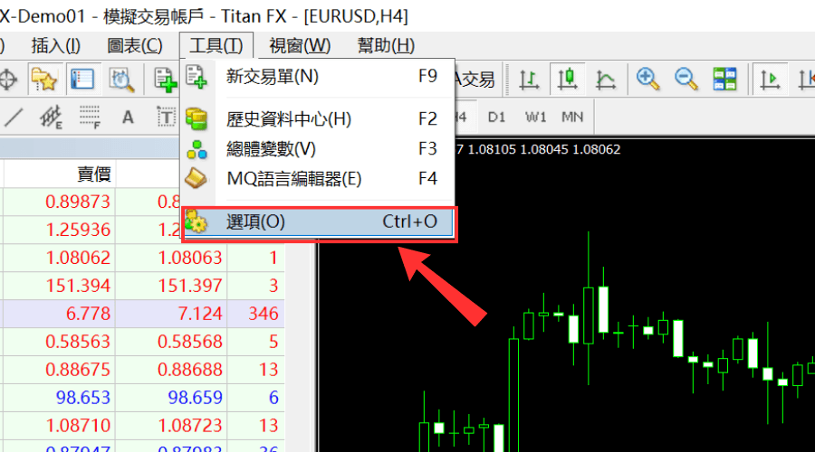1.在MT4工具选单中点击「选项」。