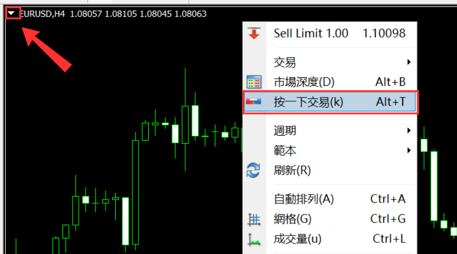 或者在图表点击右键,点选「按一下交易」。