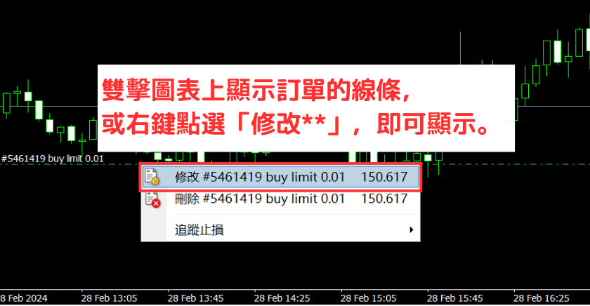 双击图表上显示订单的线条,或右键点选「修改**」,即可显示。