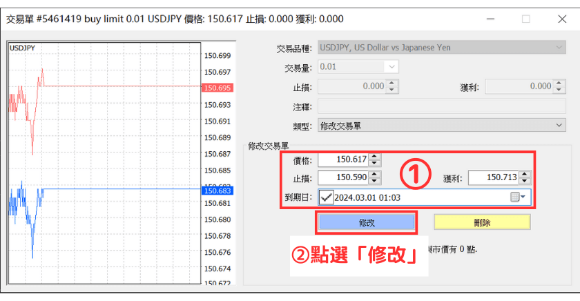 在MT4(MetaTrade 4)中,可以对限价挂单/止损挂单中的价格、有效期限等项目进行修改。 也可以直接取消限价挂单/止损挂单。