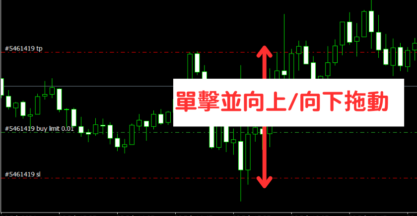 将游标放在图表上的订单水平线上,单击并向上/向下拖动TP/SL线,可修改止盈/止损价格。 拖动价格线(绿色线),则可修改挂单的价格。