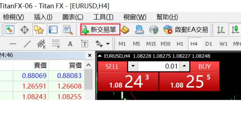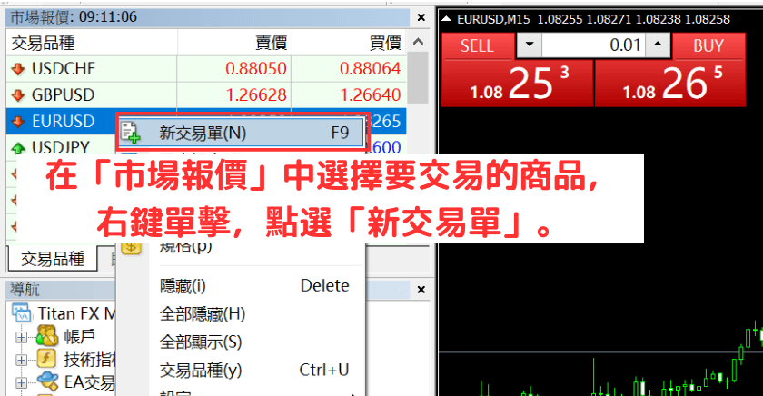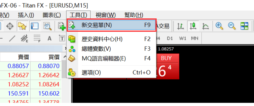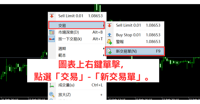 方法2:在图表上右键单击,然后选择「交易」-「新交易单」。