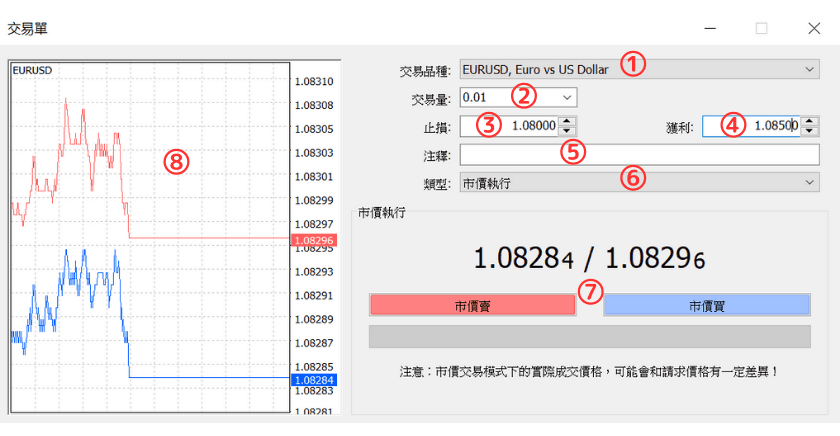 ②交易量:设定想要交易的手数。 通常外汇经纪商最小手数为0.01。