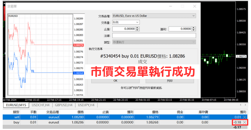 一开始无论你是买入还是卖出,终端中的「交易」选项栏的【获利(盈亏)】都是从负数开始, 这是因为当你下单时就要支付点差 给经纪商。