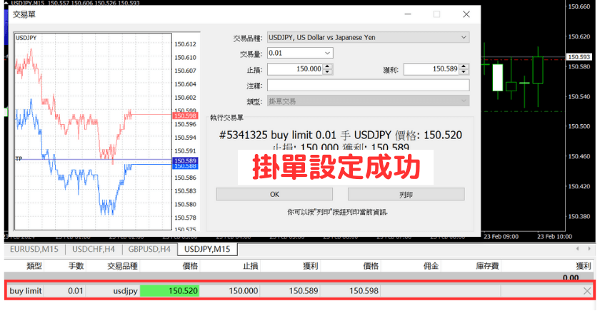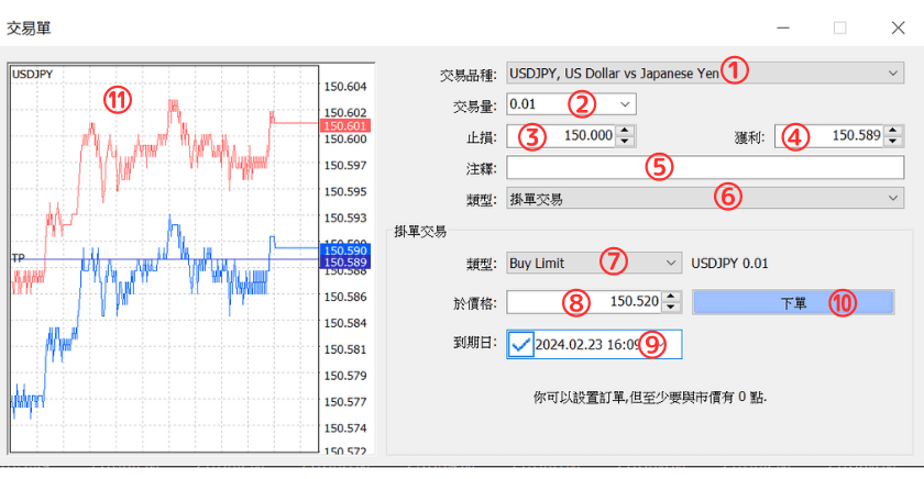 根据当前市场行情及自己的分析设定「挂单」的参数,并点选「⑩下单」完成限价挂单或停损挂单的设定。