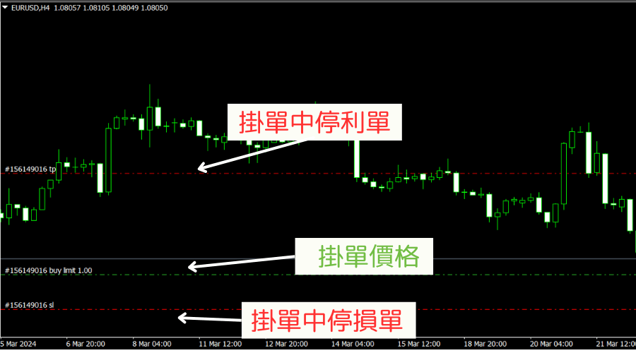 未成交的限价挂单和止损挂单也会用绿色线条在图表中显示。 另外,与其挂单相关的平仓获利单和止损单也会用红色线条显示。