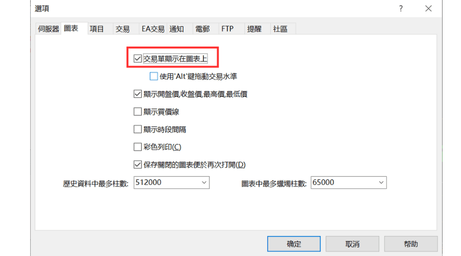 点击MT4菜单「工具」中的「选项」,然后点击「选项」视窗中的「图表」分页,勾选「交易单显示在图表上」的话就可以显示,取消勾选的话就会关闭。