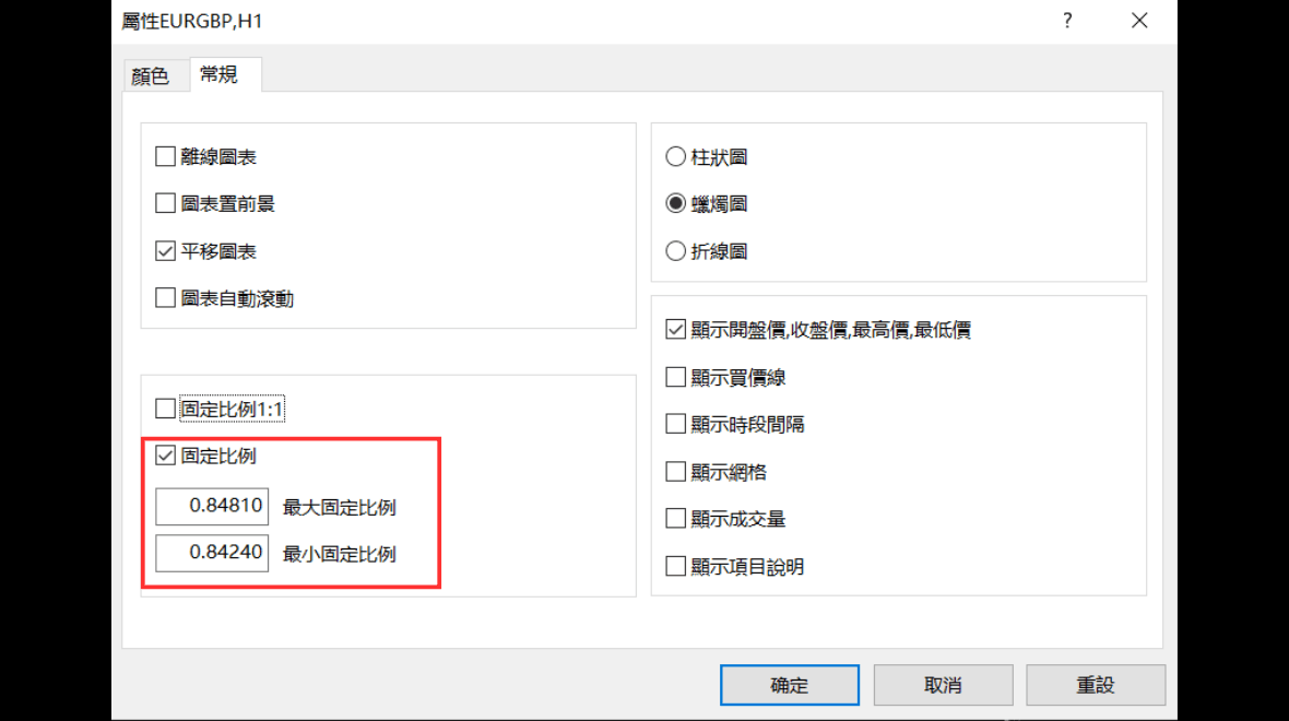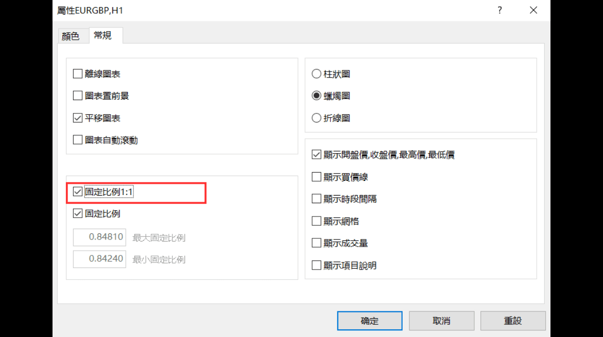 在「常规」标签页内,勾选「固定为1:1比例」。这样,图表的横轴(时间)和纵轴(价格)将以1:1的比例固定。