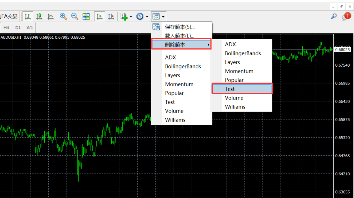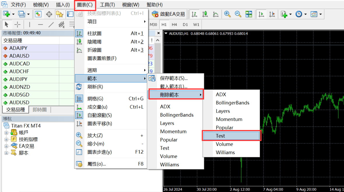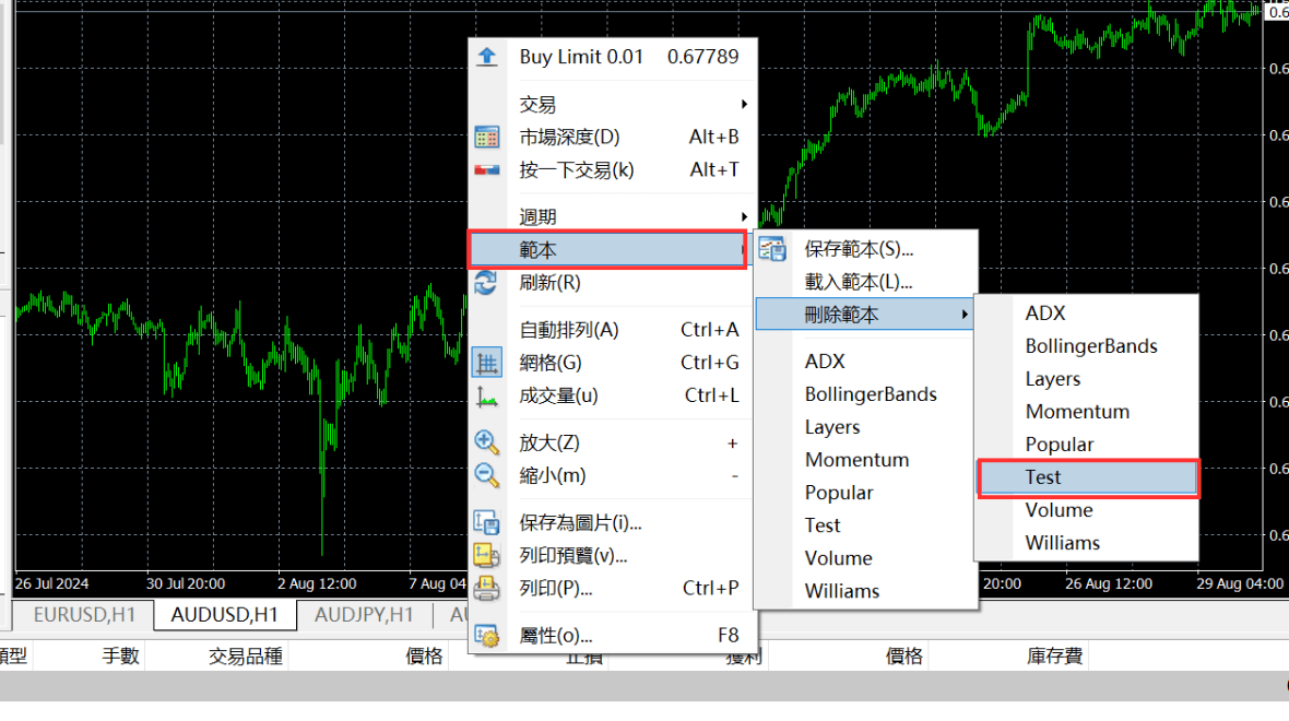 在图表上右键点击,并从弹出选单中的「范本」选项下选择「删除范本」,然后选择要删除的范本名称。