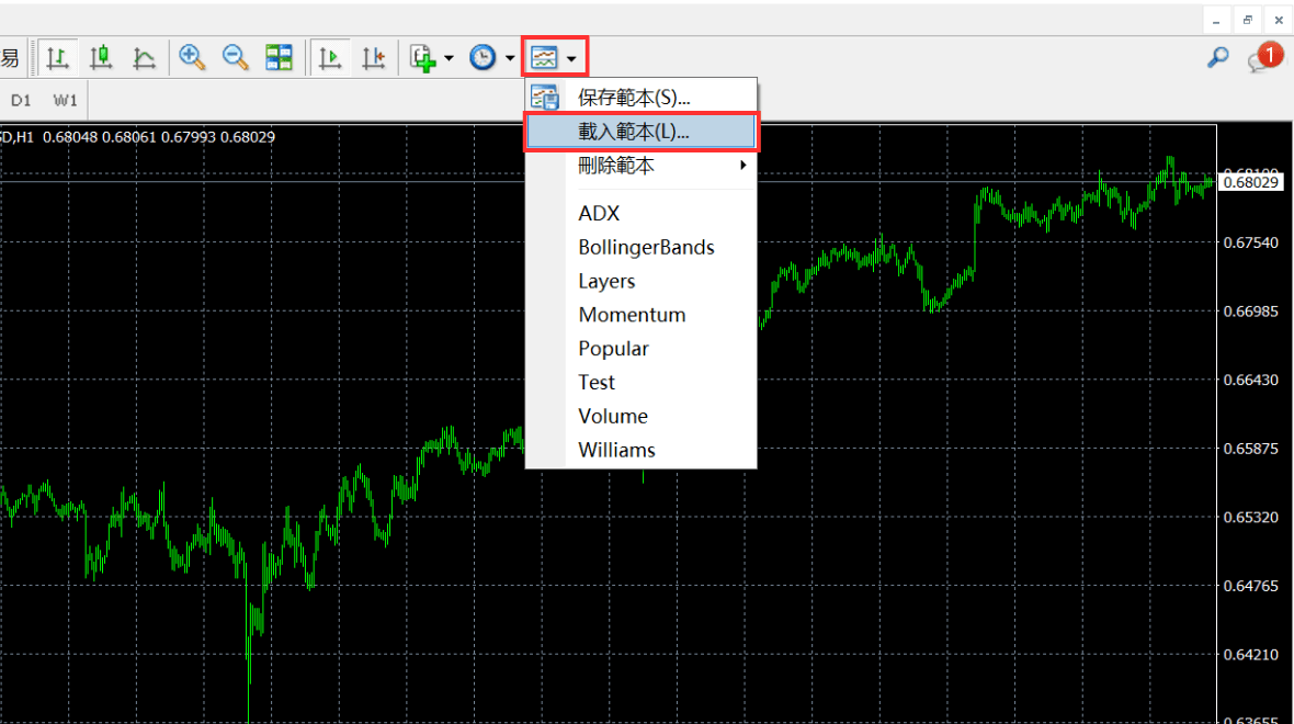 在 MT4 中,您还可以载入其他电脑或他人创建的范本进行使用。可以透过以下方式打开对话框并选择要载入的范本文件: