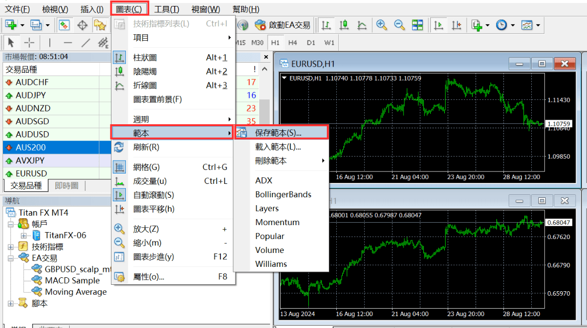 在图表上右键点击,并从弹出选单中的「范本」选项下选择「保存范本」。