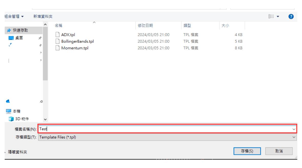 当您想要保存特定颜色配置或指标设定的图表时,可以透过以下方式开始保存设定: