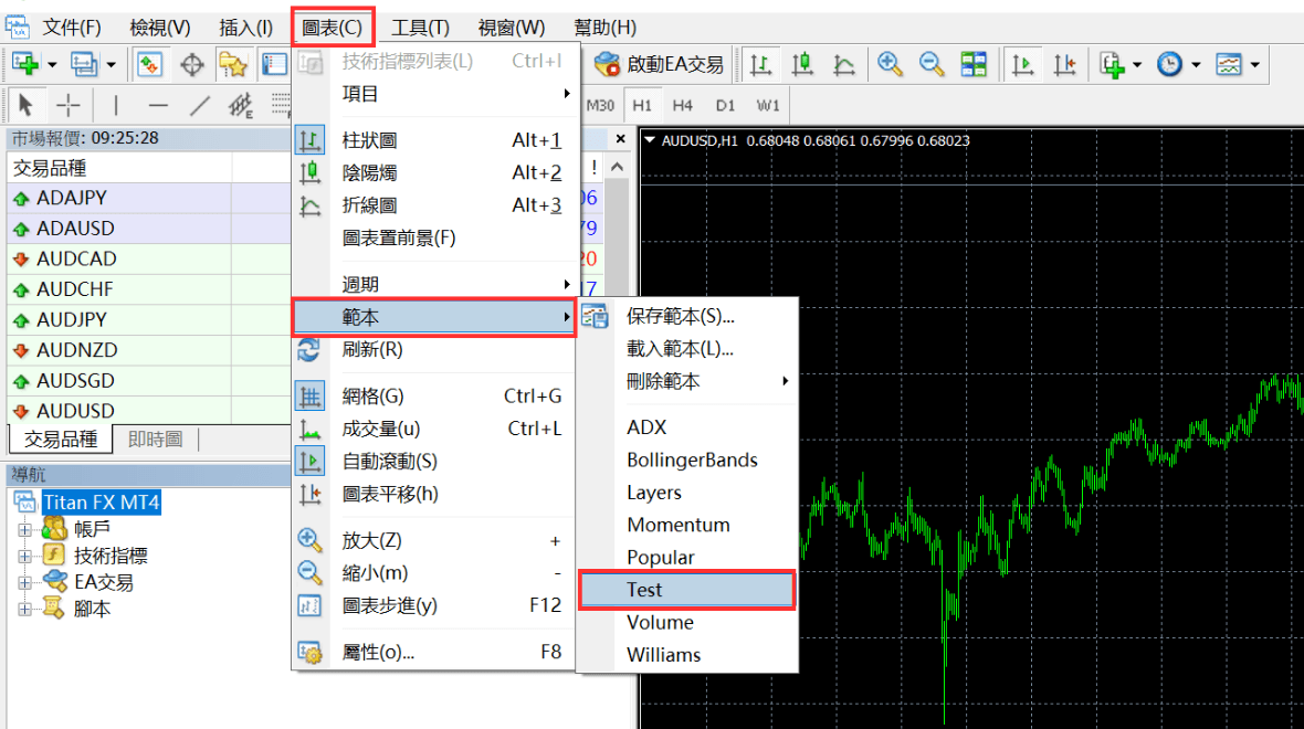 在选单中的「图表」选项下,选择「范本」内的「载入范本」。