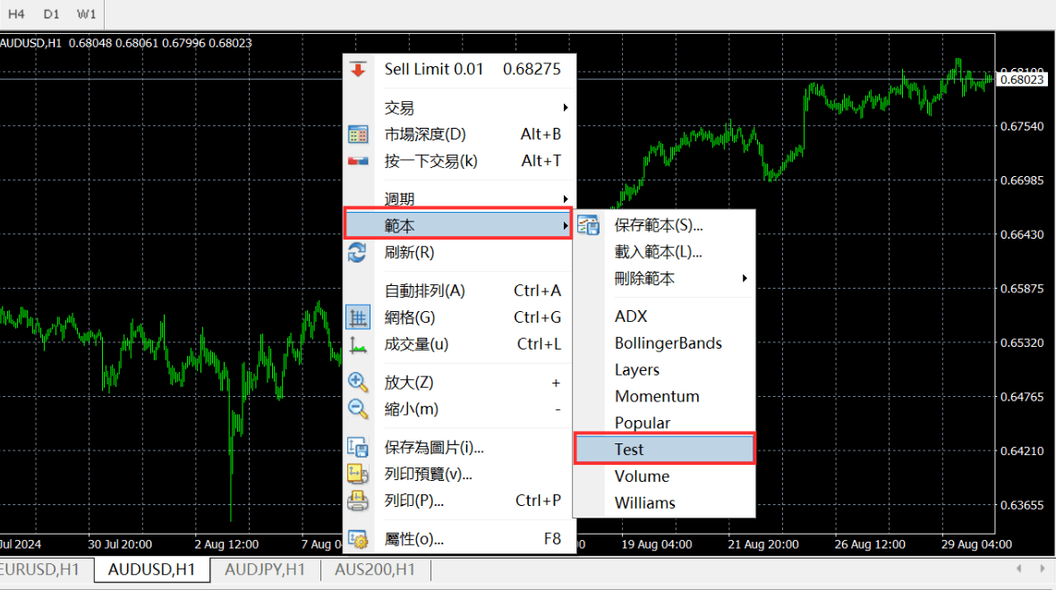 在图表上右键点击,并从弹出选单中的「范本」选项下选择「载入范本」。