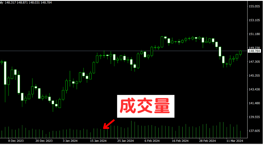 在MT4的图表中,默认为在图表下方显示成交量。 在MT4中虽然可以同时显示交易量与成交量,但是,交易品种为外汇和CFD时只能显示成交量。