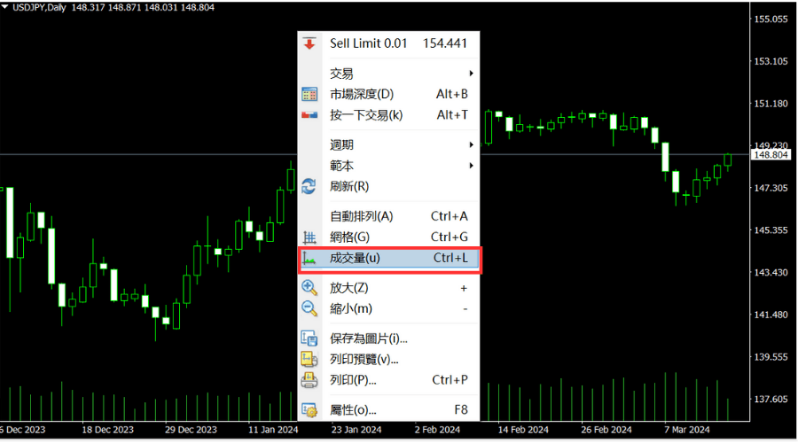 在图表中点击右键将会显示选单,然后点击选单中的成交量就可以切换为显示或不显示。