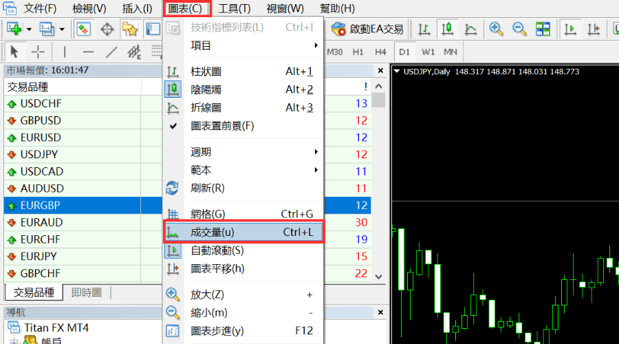 点击MT4选单「图表」中的成交量可以切换为显示或不显示。