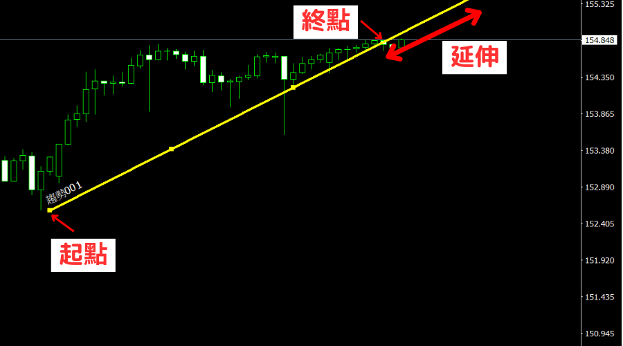点击「插入」选单中的「直线」,然后选择「趋势线」,这样就可以确认在图表中移动的光标已切换为绘制模式。