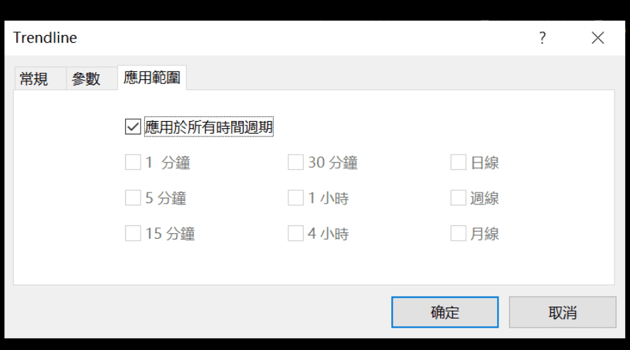 「应用范围」分页中可以指定在哪一个时间周期中显示线条。