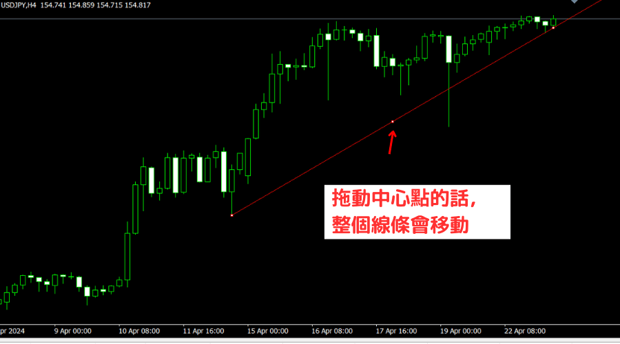 在趋势线绘制模式中,点击成为趋势线起点的地方,然后按住拖动到终点放开,这样就完成了趋势线的绘制。