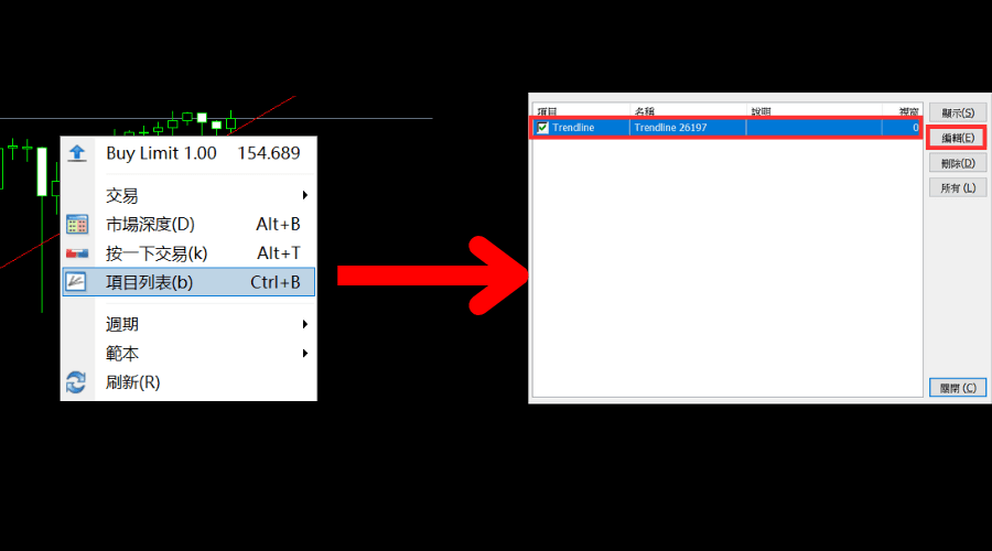 在图表中点击右键,然后点击选单中的「项目列表」,从列表一览中选择想要修改的线条,点击右侧「编辑」就可以打开线条的属性视窗。