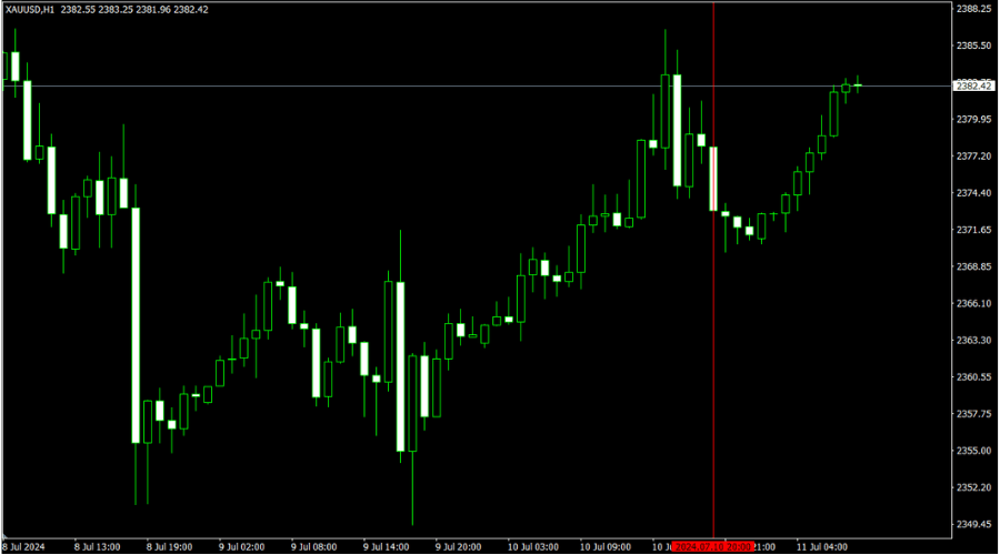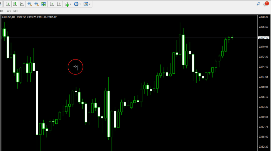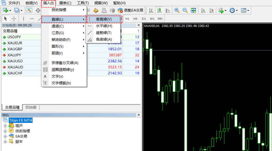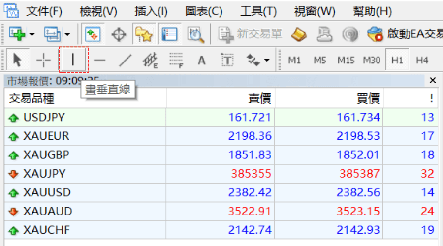 透过其中任一方法切换至垂直线模式后,游标会在图表上发生变化。