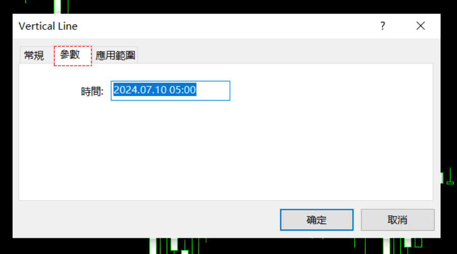 在「参数」标签中,可以通过指定时间来确定垂直线的位置。