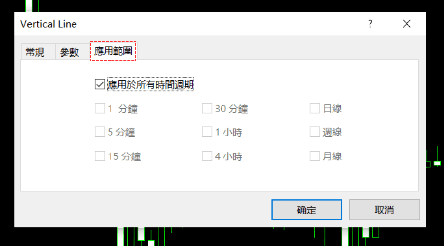 在「应用范围」标签中,可以选择垂直线显示在哪些时间周期(框架)。如果取消「应用于所有时间周期」的勾选,只会在选择的时间周期中显示垂直线。
