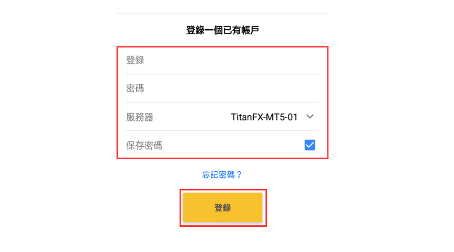 在「登录一个已有账户」中输入「MT5账号」、「密码」、然后选择「服务器」,勾选「保存密码」,最后点击下方「登录」就可以添加。