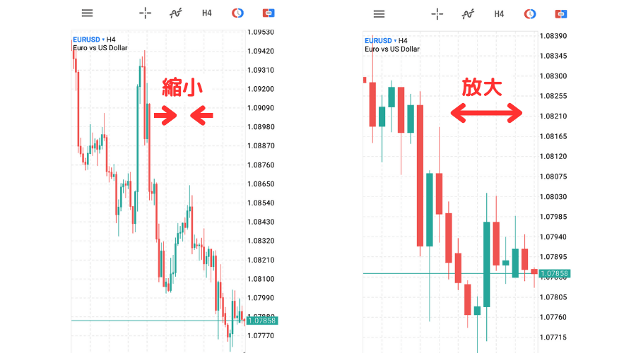 放大和缩小图表时,可以在图表中用2个手指捏放来进行调整。