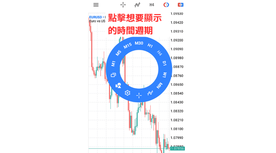 变更时间周期时,点击图表中点击一下就会出现圆形选单,然后在选单中点击想要显示的时间周期。