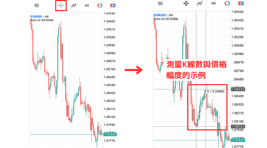 Android版MT5的十字线模式除了可以显示十字线位置的时间与价格以外,当按住一个位置,然后再点击另外一个位置时还可以测量K线数与价格幅度。