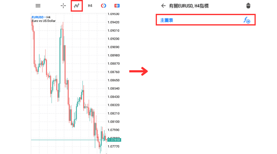 在图表中添加指标时,点击图表上方的指标图标,在「指标」界面中点击「主图表」。