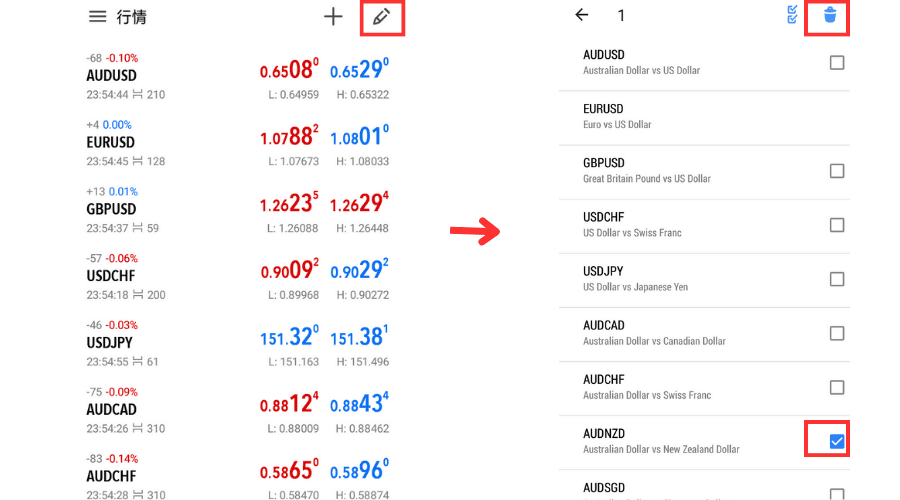 点击右上方的垃圾桶图标后,勾选想要删除的交易品种,然后再次点击垃圾桶图标,这样就可以删除。