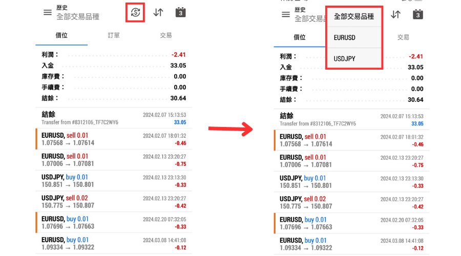 点击交易历史界面上方的「$」图标,这样就可以指定在交易历史中所显示的交易品种。