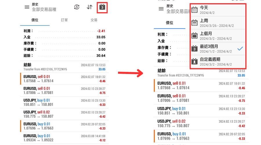 点击交易历史界面上方的「日历」图标,可以选择想要显示的周期。