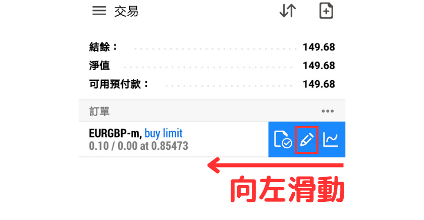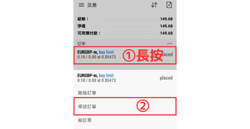 ①在「交易」界面上长按想要修改的订单。