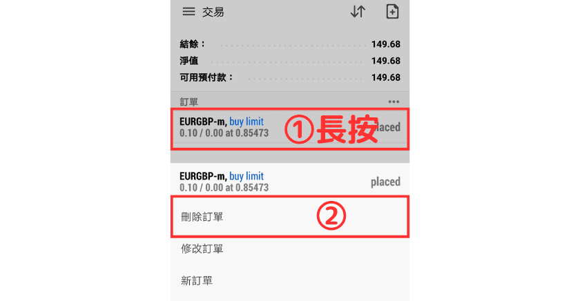①在「交易」界面上长按想要取消的订单。