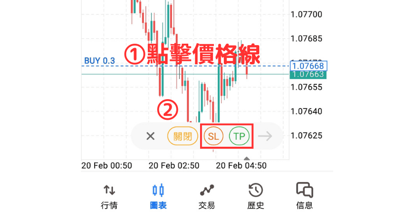 ③拖动出现的SL(止损)和TP(止盈)线条。