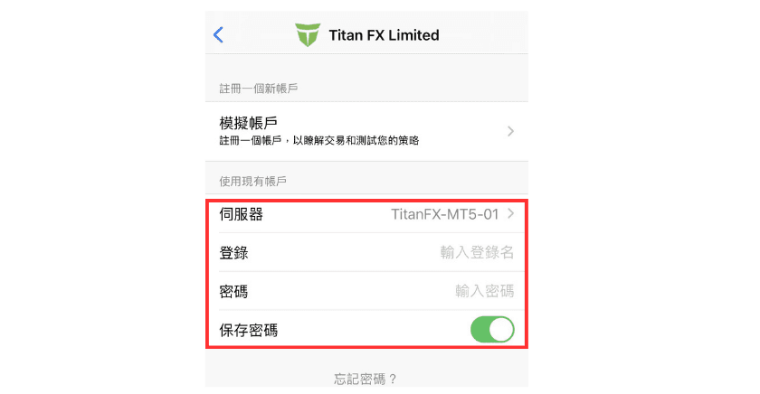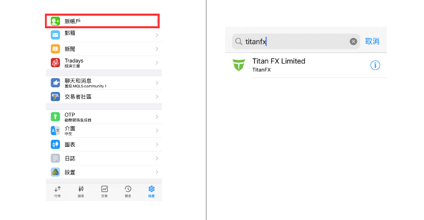 然后点选右下方「设置」,并选择「新账户」。 切换到伺服器选择界面后,在搜寻框中输入 "titanfx",然后从显示的伺服器清单中点选 "Titan FX Limited"。