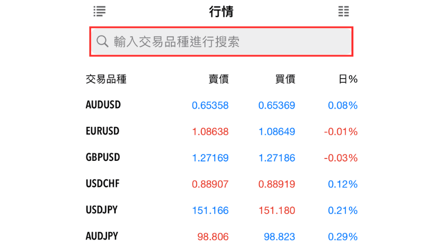 在行情界面上方的搜索框中输入想要添加的交易品种,然后点击交易品种左边的「+」按钮,或者点击搜索框时,点击在下方显示的交易品种类别,然后点击想要添加的交易品种 左边的「+」按钮,这样就可以添加在行情中。